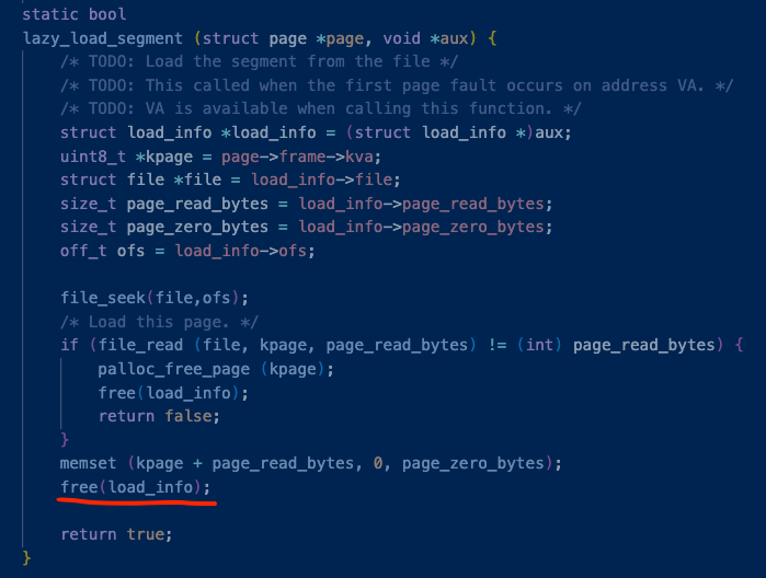 근데 이때, page 시작부분을 체크하는 uninit 에 aux값으로 저장해놓는 load_info 구조체가 있다.