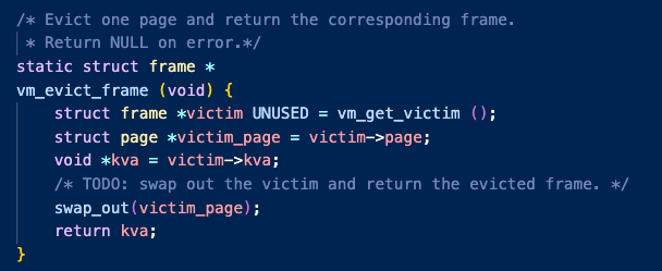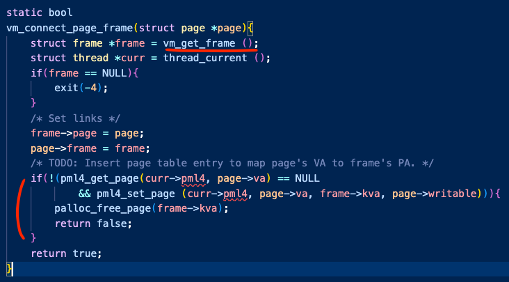 그전에 먼저 vm_connect_page_frame을 통해 frame 퇴거 정책을 통해 frame에 공간을 마련하도록 했다.