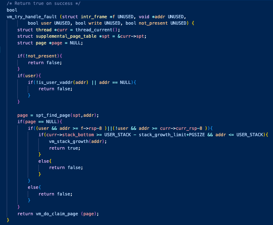 이 함수는 2주차 userprog를 구현할 때, 하단에 VM과 USERPROG 주차가 define 커맨드로 구분되어 있었다.