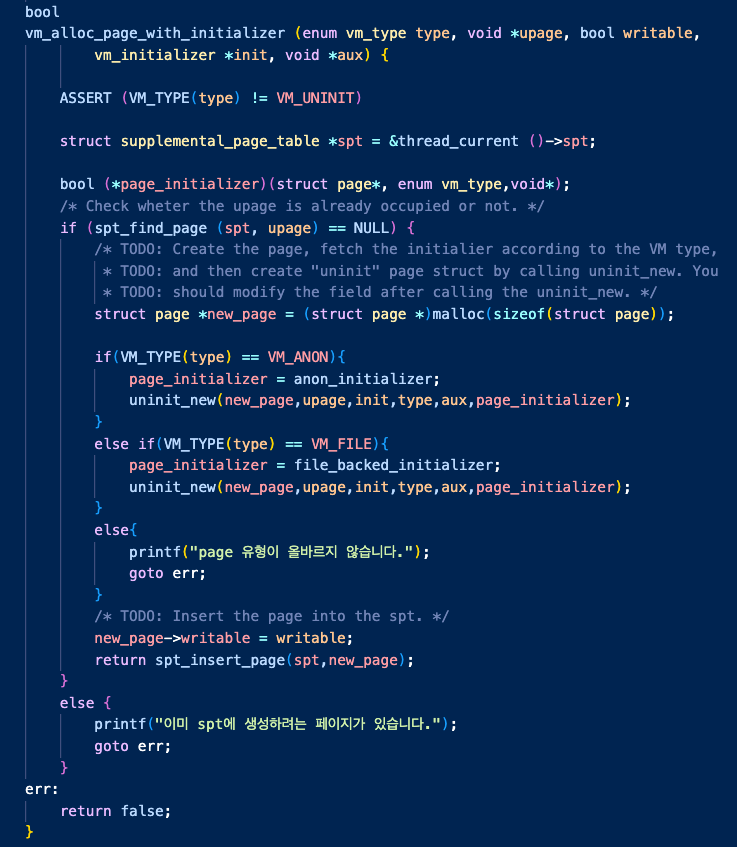 unint을 만드는 uninit_new() 함수를 통해 가상의 struct uninit page를 생성하여 spt에 insert하였다.