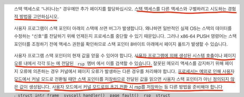 나는 개인적으로 또 다른 정당한 예외 page fault 상황인 stack growth가 가장 개념적으로 이해하기 어려웠다.