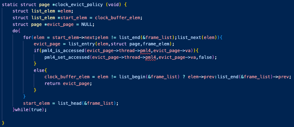 다른 퇴거 정책도 테스트해볼 미래를 위해 의존성을 낮추고 싶어 clock_evict_policy() 함수를 새로 구현했다.