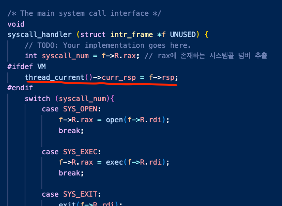 따라서 system call을 요청받은 즉시 사용자의 rsp를 기억하도록 스레드 멤버에 저장해뒀다가(내 코드 상에선 curr_rsp)