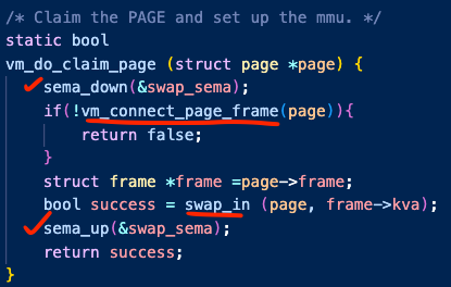이후 파일이나 anon 페이지를 프레임으로 올리는 swap_in 함수에에서는 공간이 있다고 판단하고 작업을 진행하기 때문에 동기화를 꼭 사용해줘야만 했다.