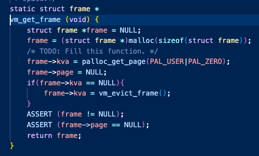 위의 사진은 vm_connect_page_frame() 이다. vm_get_frame() 함수를 통해 퇴거 정책을 수행하는 함수로 들어간다.