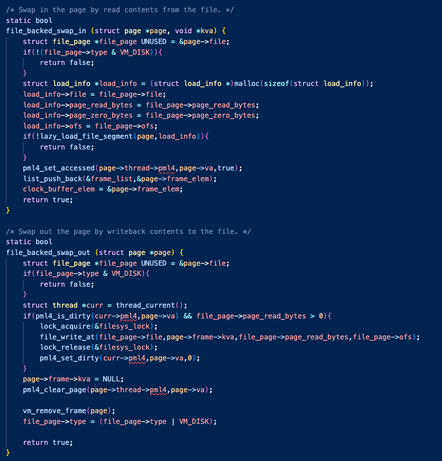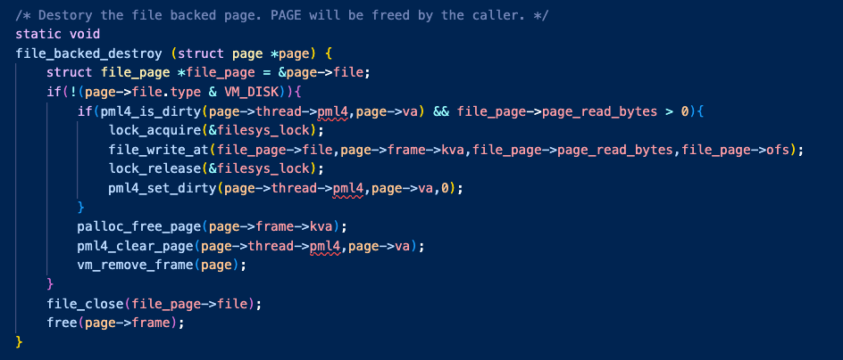 따라서 'file_backed_swap_out'은 'file_backed_destroy'에서 구현한 것과 매우 비슷하게 작성했고,