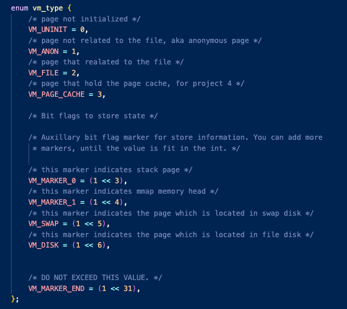 이 enum vm_type를 잘 살펴보면 비트로 마킹해놓을 수 있게 해 놓았다.