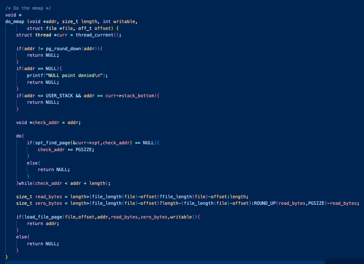 프로세스를 로드할때 사용했던 방식이 file을 읽어 페이지에 저장한 것인데, 이는 do_mmap()이 원하는 방식과 동일하기에 거의 비슷하게 함수를 가져와 수행했다.