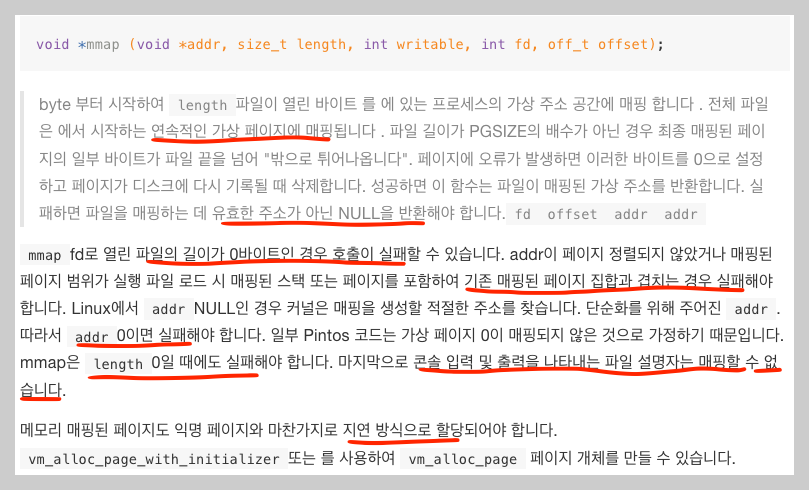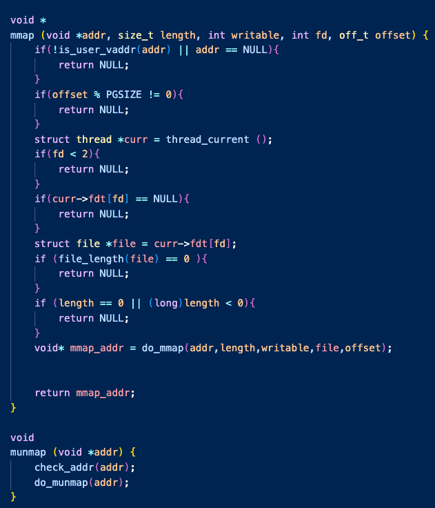 이 구현은 munmap() 함수에서 mmap 된 페이지 세그먼트의 시작 페이지를 식별하기 위해 이전에 말했던 마커를 추가해주기 위해 저렇게 구현했다.