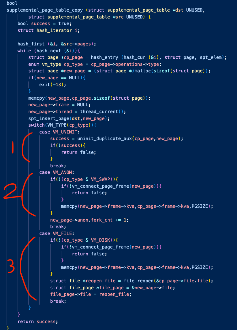 이전엔 물리 메모리가 가상화되어 있지 않았으므로 그저 pml4를 전체 탐색하여 모든 페이지를 자식에게 복사해주기만 하면 되었지만 이제는 spt 테이블을 통해 메모리를 가상화하였으므로 spt의 내용을 복제하고 유형별로 물리 메모리도 할당해주어야 한다.
