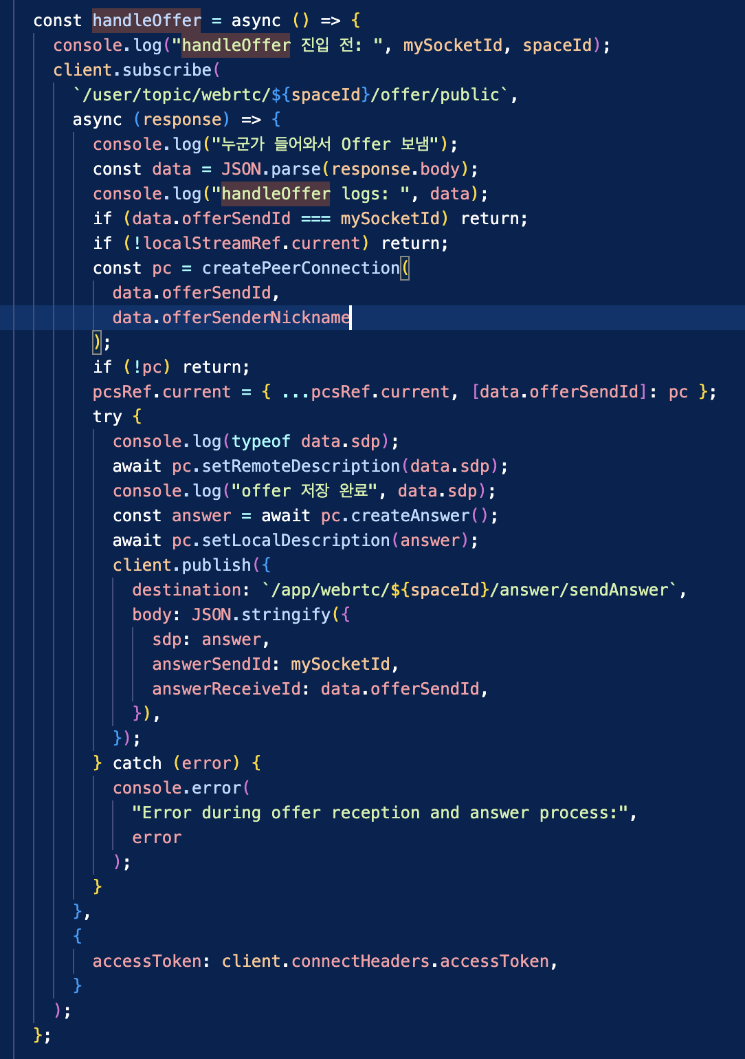 아무튼 HandleOffer는 작업실에 이미 접속해있는 클라이언트 기준으로 누군가 접속하여 나한테 Offer를 보냈을 경우 수행된다.