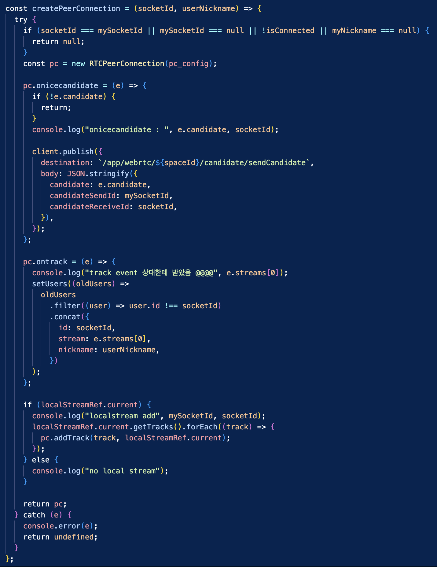 이 함수에서 직접적으로 WebRTC 외부 함수 및 Stun, Turn 서버를 사용하여 나의 객체를 선언하고, 이 객체를 통한 offer, answer를 생성한 뒤 client끼리 주고받으면서 직접 P2P 위치를 저장하게 되고, 결과적으로 중간 서버 없이 stream 공유가 가능하게 된다.